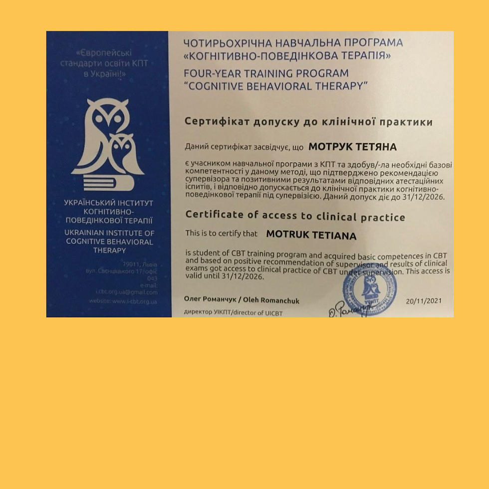 В 2020 році вступає в УІКПТ на базову 4-х річну програму з когнітивно-поведінкової терапії, отримує доступ до клінічної практики в методі.